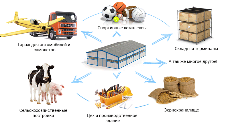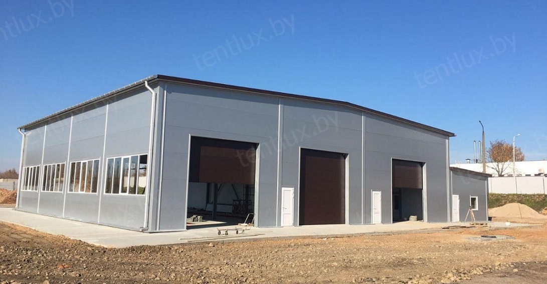 Эти здания не имеют ограничения по таким параметрам как высота, ширина и длина, они универсальны в эксплуатации. Заказчик может заказать любые габариты. В таком здание можно установить любое грузоподъемное оборудование и не только. Количество ворот и окон определяется с заказчиком.